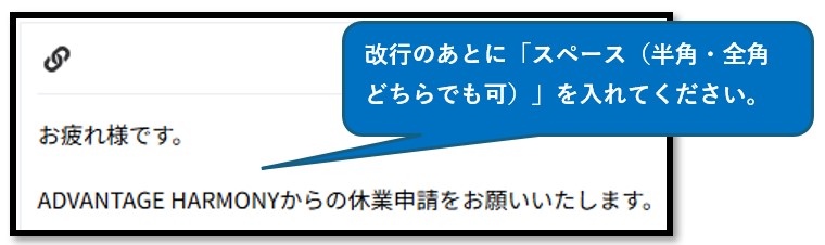 改修完了までは改行のあとに「スペース(半角・全角どちらでも可)」を入れて送信をお願いいたします。